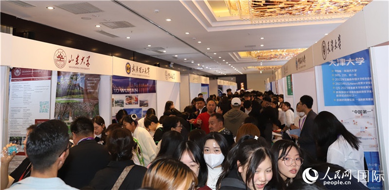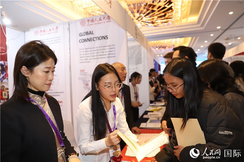 | 10月8日,沈敏娟(左二)大使在高校展位。人民網(wǎng)記者 霍文攝 |