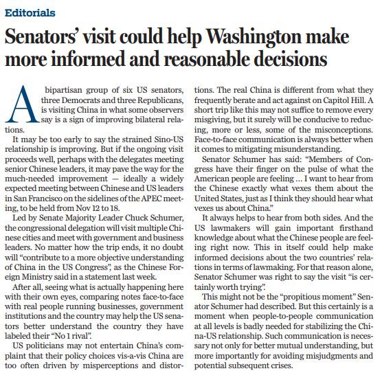 原文標(biāo)題:Senators’ visit could help Washington make more informed and reasonable decisions: China Daily editorial