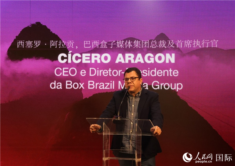 巴西盒子媒體集團(tuán)總裁及首席執(zhí)行官西塞羅·阿拉貢在活動現(xiàn)場致辭。人民網(wǎng)記者 時元皓攝