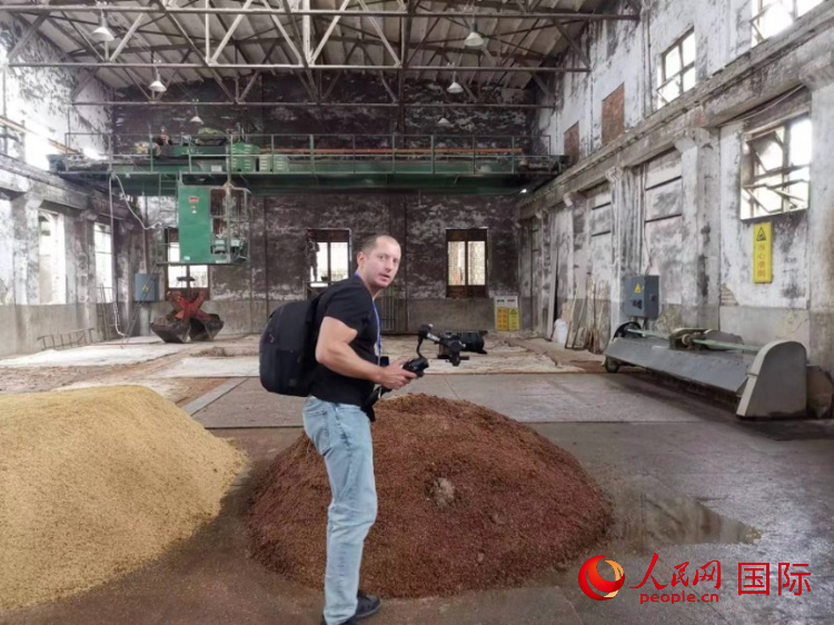 | 俄羅斯金磚電視臺攝像師帕維爾·波洛溫卡拍攝西鳳酒釀酒舊址。人民網(wǎng)記者 楊倩攝 |