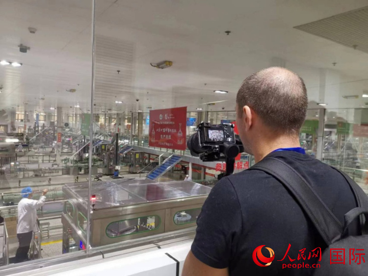 | 俄羅斯金磚電視臺攝像師帕維爾·波洛溫卡拍攝西鳳酒現(xiàn)代化生產(chǎn)車間。人民網(wǎng)記者 楊倩攝 |