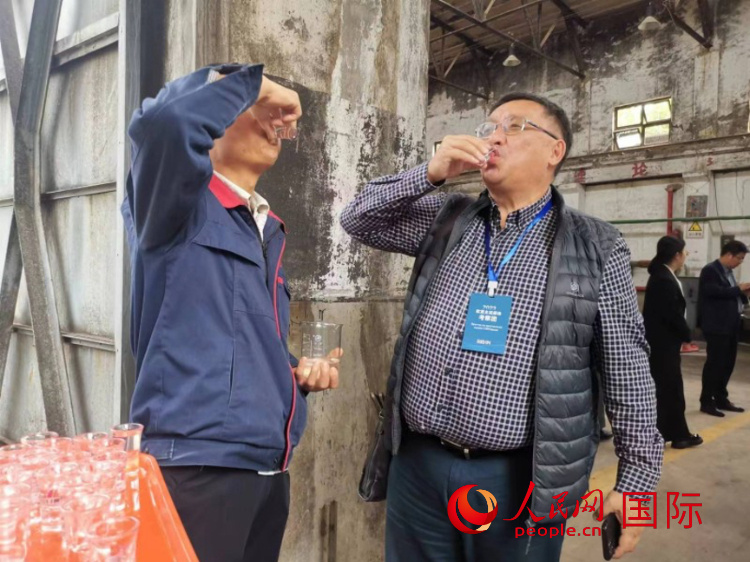 | 哈薩克斯坦《實(shí)業(yè)報(bào)》總編輯謝里克·科爾茹姆巴耶夫品嘗西鳳酒。 人民網(wǎng)記者 楊倩攝 |