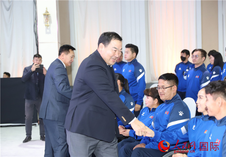 | 10月14日,巴特額爾登主席與運(yùn)動員握手。人民網(wǎng)記者 霍文攝 |