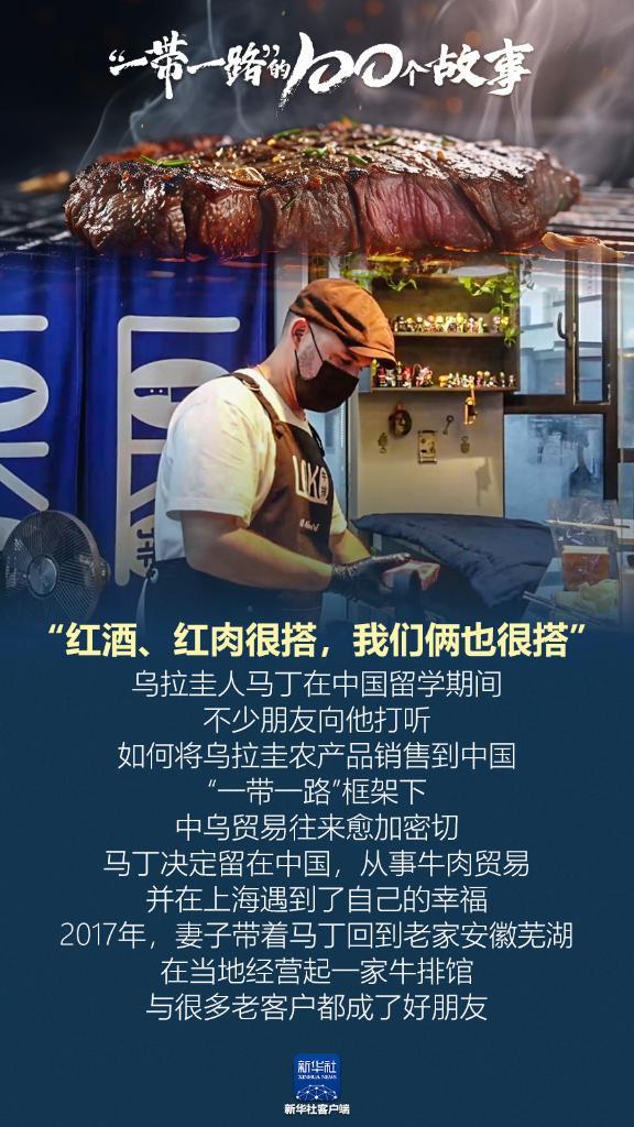 “紅酒、紅肉很搭,我們倆也很搭?!睘趵缛笋R丁在中國留學(xué)期間,不少朋友向他打聽如何將烏拉圭農(nóng)產(chǎn)品銷售到中國?!耙粠б宦贰笨蚣芟?,中烏貿(mào)易往來愈加密切。馬丁決定留在中國,從事牛肉貿(mào)易,并在上海遇到了自己的幸福。2017年,妻子帶著馬丁回到老家安徽蕪湖,在當?shù)亟?jīng)營起一家牛排館,與很多老客戶都成了好朋友。(記者:戴威)