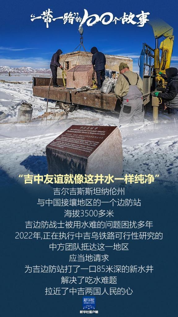 “吉中友誼就像這井水一樣純凈”。吉爾吉斯斯坦納倫州與中國接壤地區(qū)的一個邊防站,海拔3500多米,吉邊防戰(zhàn)士被用水難的問題困擾多年。2022年,正在執(zhí)行中吉烏鐵路可行性研究的中方團(tuán)隊(duì)抵達(dá)這一地區(qū),應(yīng)當(dāng)?shù)卣埱螅瑸榧叿勒敬蛄艘豢?5米深的新水井,解決了吃水難題,拉近了中吉兩國人民的心。
