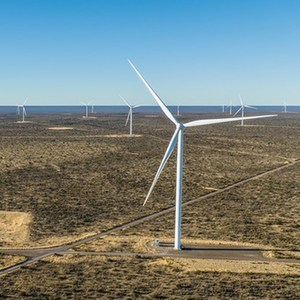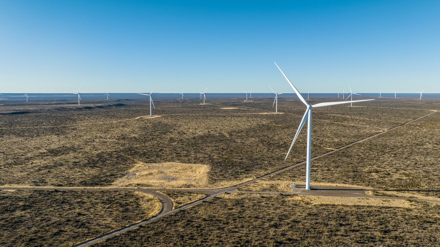 這是6月12日在阿根廷丘布特省馬德林港拍攝的羅馬布蘭卡一期風電場(航拍照片)。新華社記者 王天聰 攝