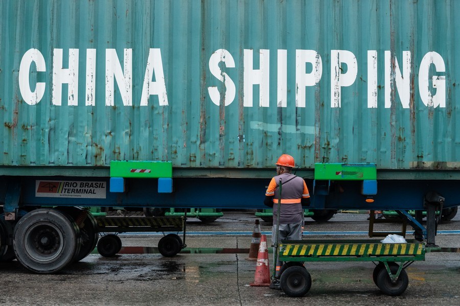 9月15日,在巴西里約熱內(nèi)盧港,“新南通”號進行集裝箱裝卸作業(yè)。新華社記者 王天聰 攝
