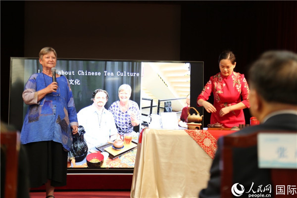 | 福建名茶的美國(guó)粉絲辛迪·忒斯庫(kù)(Cindy Tuisku)向前來(lái)參加推介會(huì)的嘉賓講述功夫茶道。人民網(wǎng)記者 鄧圩攝 |