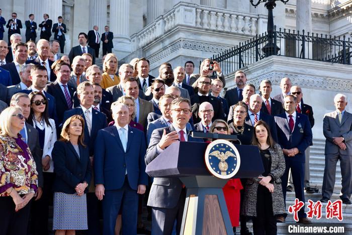 約翰遜當(dāng)選議長(zhǎng)后在記者會(huì)上表示,過(guò)去幾周的議長(zhǎng)選舉讓共和黨人“更強(qiáng)大”,“我們將立刻全力以赴開(kāi)始工作”。 中新社記者 沙晗汀 攝