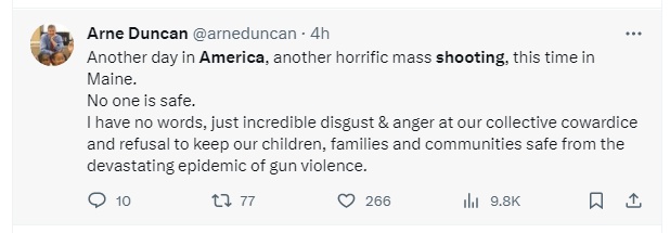 網(wǎng)友“Arne duncan”表示,美國(guó)的又一天,又一起可怕的大規(guī)模槍擊案,這次發(fā)生在緬因州。沒有人是安全的。我無言以對(duì),只是對(duì)我們集體的懦弱和拒絕保護(hù)我們的孩子、家庭和社區(qū)免受槍支暴力感到十分厭惡和憤怒。