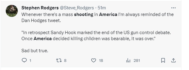網(wǎng)友“stephen Rodgers”稱,每當(dāng)美國(guó)發(fā)生大規(guī)模槍擊事件時(shí),我總會(huì)想起丹·霍奇斯的推特:‘回想起來,桑迪胡克槍擊案標(biāo)志著美國(guó)槍支管制辯論的結(jié)束。一旦美國(guó)認(rèn)為殺害兒童是可以忍受的,一切就結(jié)束了?!瘋麉s真實(shí)。