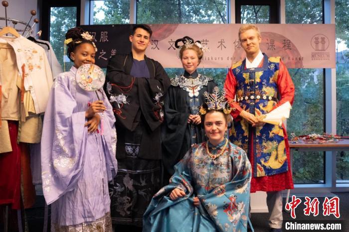 圖為德國學(xué)生身著漢服參與漢文化體驗(yàn)課程,學(xué)習(xí)漢服文化。漢文化藝術(shù)交流中心供圖