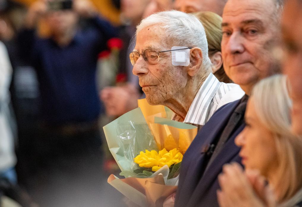 11月3日,103歲的飛虎隊老兵哈里·莫耶(左)在昆明市外國語學(xué)校觀看表演。新華社記者 王安浩維 攝