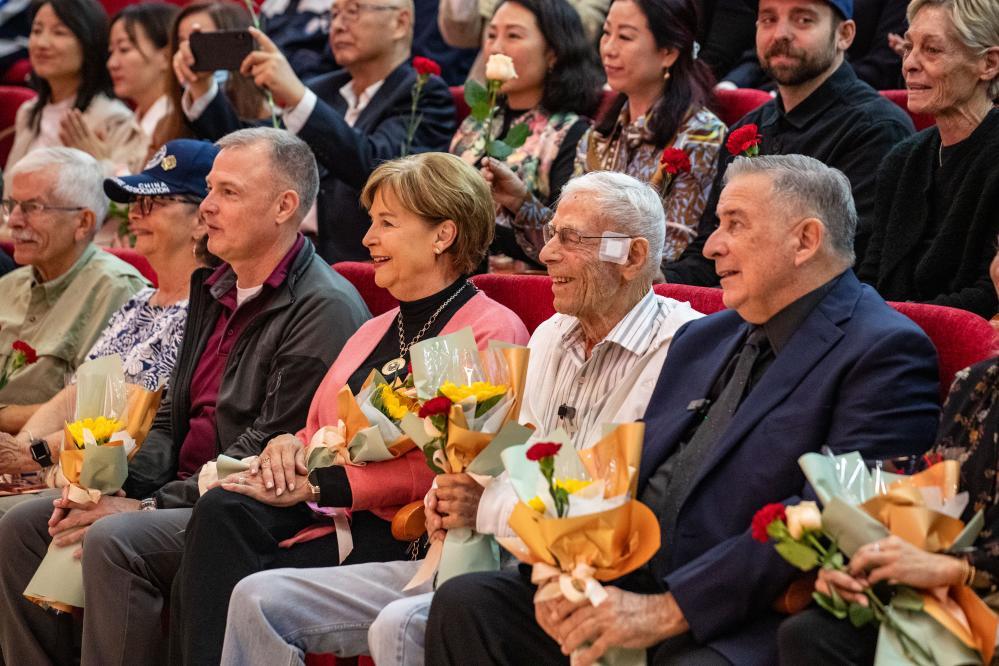 當(dāng)莫耶步入學(xué)校禮堂,現(xiàn)場響起熱烈的掌聲,歡迎這位曾幫助中國人民抗擊日本侵略者的英雄。剛過完103歲生日的莫耶,頭戴繡有飛虎隊圖案的帽子,精神飽滿地走向?qū)W生中間,脫帽揮手致意。