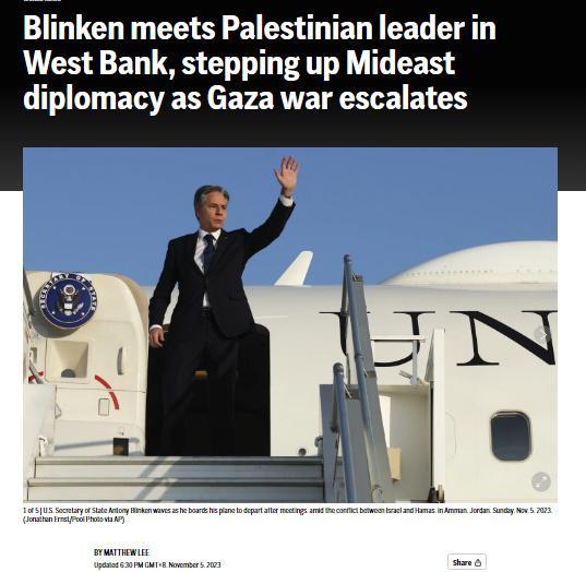 據(jù)報道,這是本輪巴以沖突爆發(fā)以來,美國最高級別外交官首次到訪約旦河西岸。