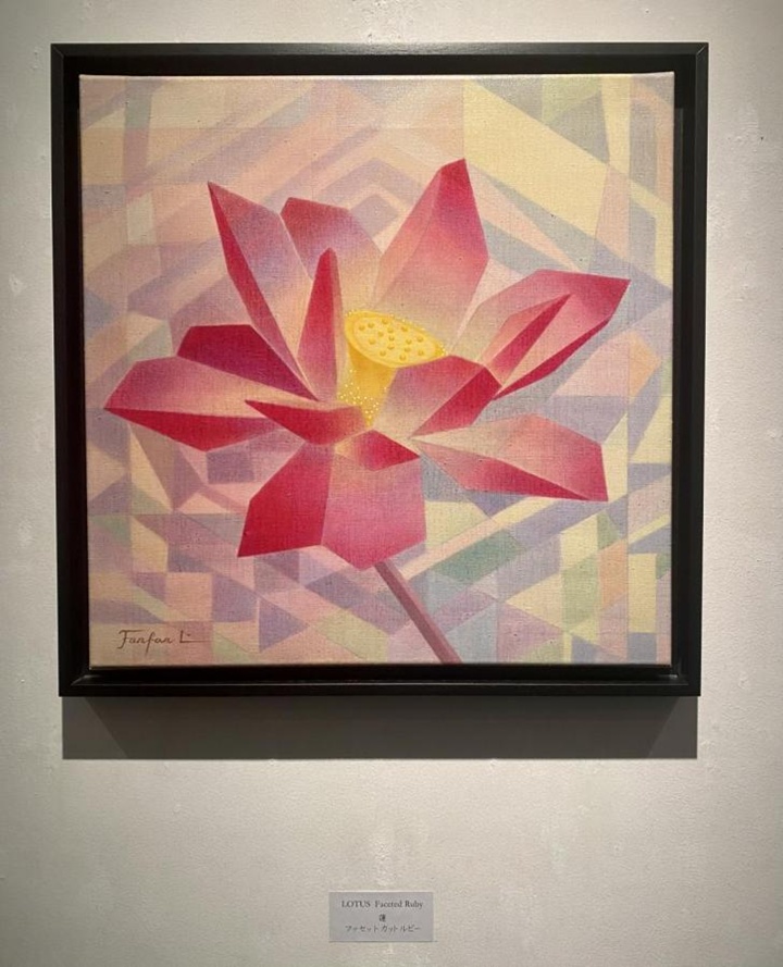 在此次畫(huà)展上,李芳芳共展出12副作品。其中以蓮花和蜻蜓等自然元素為主題的畫(huà)作6幅,以星座、宇宙為主題的畫(huà)作6幅。古井畫(huà)廊負(fù)責(zé)人古井篤志表示:“李芳芳的作品以自然和宇宙為核心,表現(xiàn)手法上將東西方美學(xué)融合在一起,在纖細(xì)中體現(xiàn)美,這種風(fēng)格在日本非常受歡迎。”