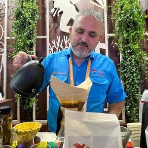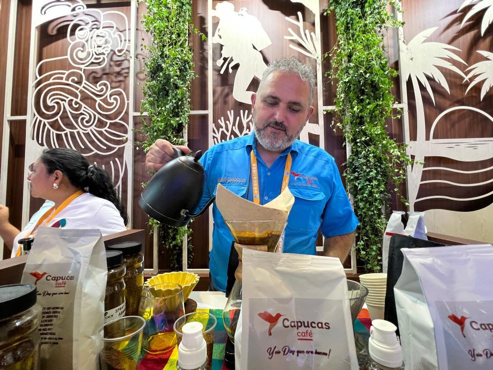 咖啡企業(yè)Capucas總經理何塞·奧馬爾·羅德里格斯現(xiàn)場制作咖啡。新華社記者成欣 攝