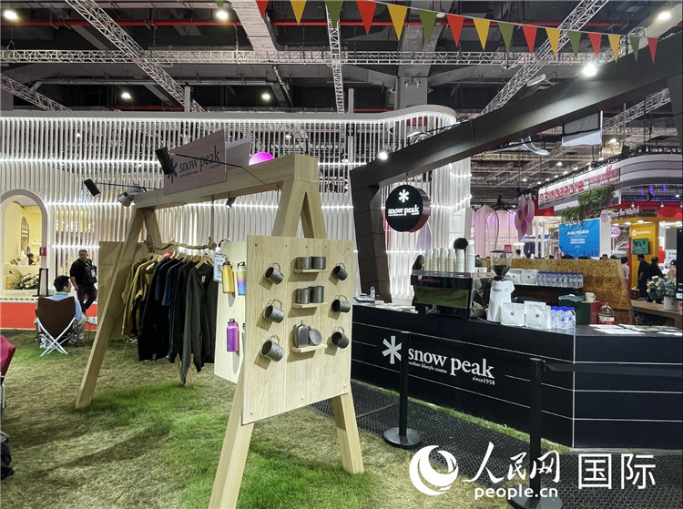 | 日本品牌SnowPeak展出了便攜式野營鈦杯、酒壺、服裝等戶外用品。人民網(wǎng)記者 袁蒙攝 |
