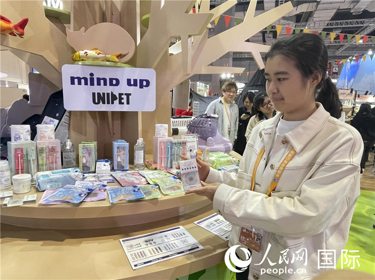 | 日本寵物用品品牌MIND UP展臺(tái),工作人員正在向記者展示可凈化寵物飲用水水質(zhì)等多離子釋放板。人民網(wǎng)記者 袁蒙攝 |