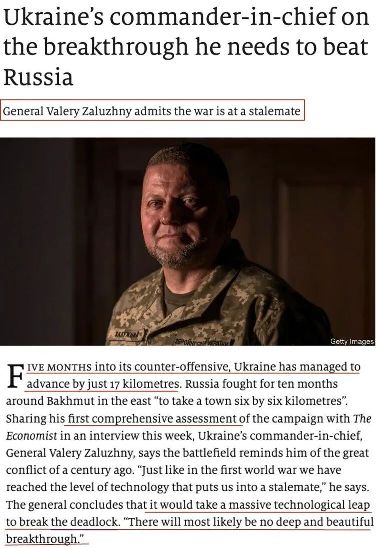 8月中旬以來,烏克蘭籌備已久的反攻進展緩慢,而俄羅斯在庫皮揚斯克、紅利曼、頓涅茨克、扎波羅熱、赫爾松等方向發(fā)動攻勢且取得一定進展。烏軍總司令扎盧日內(nèi)日前接受《經(jīng)濟學(xué)人》雜志采訪時首次承認,與俄羅斯的戰(zhàn)事已陷入僵局。盡管反攻持續(xù)數(shù)月,但前線幾乎沒有發(fā)生任何變化。