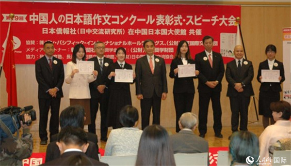 日本駐華大使垂秀夫?yàn)楂@得最優(yōu)秀獎(jiǎng)的趙志琳同學(xué)頒獎(jiǎng)。人民網(wǎng)記者 陳建軍攝
