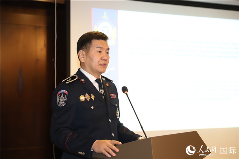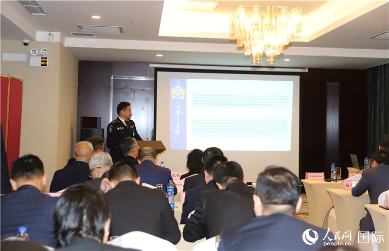 | 11月12日,蒙古國(guó)警察總局偵察局反侵害人身健康處長(zhǎng)巴彥孟和中校講解案例。人民網(wǎng)記者 霍文攝 |