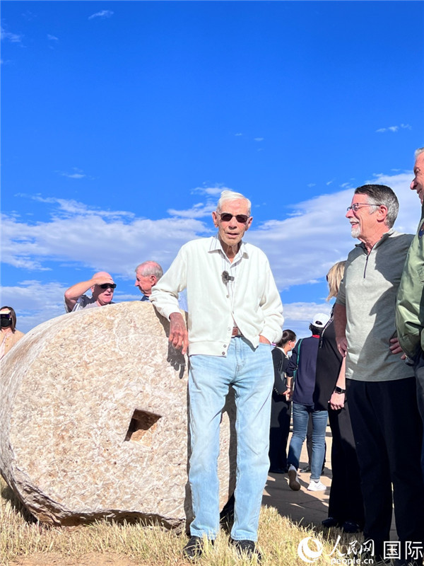 103歲的飛虎隊(duì)老兵哈里·莫耶在云南昆明呈貢機(jī)場(chǎng)舊址的石碾前留影。人民網(wǎng) 趙瞳攝