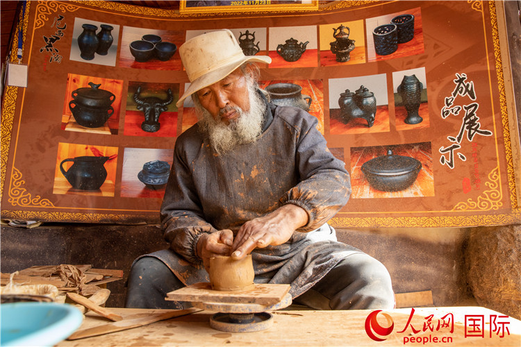 | 2023年11月16日,云南省迪慶藏族自治州香格里拉市尼西鄉(xiāng)湯滿村,66歲的黑陶手藝人格茸汪堆在制作黑陶。人民網記者 虎遵會攝 |
