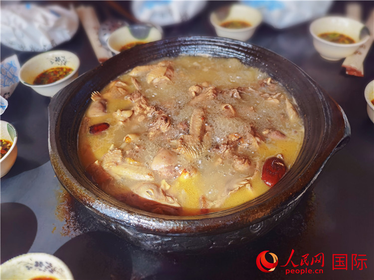| 2023年11月16日,云南省迪慶藏族自治州香格里拉市尼西鄉(xiāng)湯堆村,黑陶鍋烹飪的尼西雞。人民網記者 杜明明攝 |