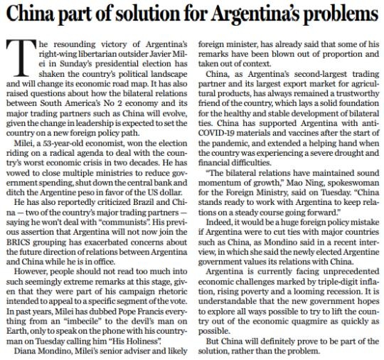 不過,在現(xiàn)階段,外界不應過度解讀這類看似極端的言論,畢竟那只是他在競選過程中的部分表態(tài)。米萊的外事顧問迪亞娜·蒙迪諾也表示,外界對米萊的外交政策存在誤讀,沒有哪個國家可以脫離外交關系來發(fā)展經貿合作。