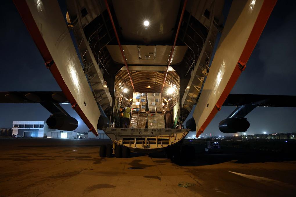 12月6日,在約旦首都安曼的馬爾卡機(jī)場(chǎng),一架飛機(jī)裝載將運(yùn)往加沙地帶的人道主義物資。新華社發(fā)(穆罕默德·阿布·古什攝)