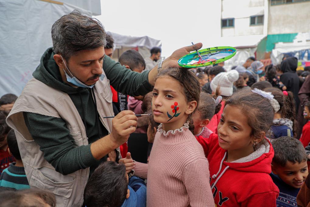 12月7日,在加沙地帶南部城市拉法的一處臨時(shí)庇護(hù)所內(nèi),志愿者和兒童進(jìn)行互動(dòng)。新華社發(fā)(里澤克·阿卜杜勒賈瓦德攝)