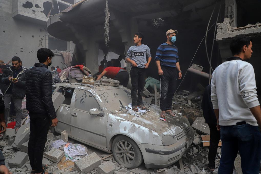 12月7日,在加沙地帶南部城市汗尤尼斯,巴勒斯坦人查看遭以軍襲擊后的廢墟。新華社發(fā)(里澤克·阿卜杜勒賈瓦德攝)