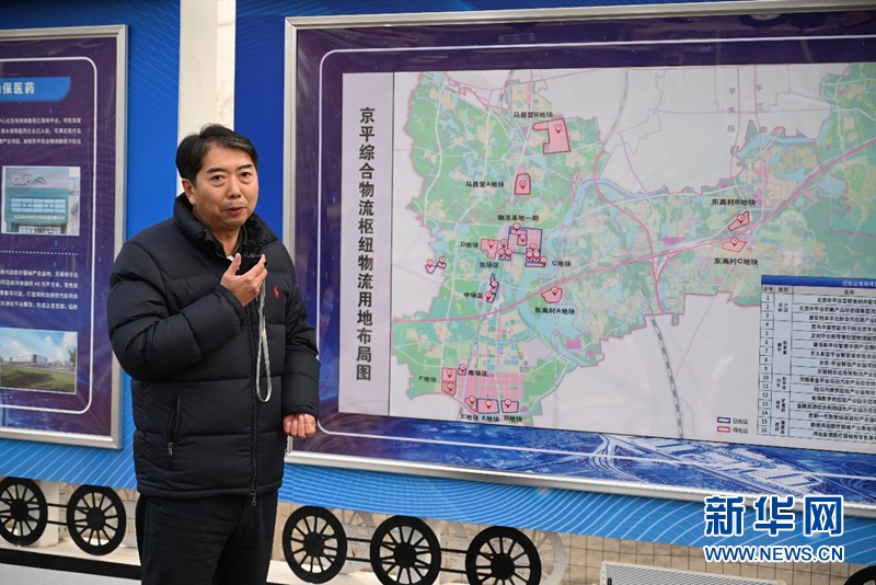 12月8日,北京市平谷區(qū)馬坊鎮(zhèn)黨委書記秦海濱向媒體團(tuán)介紹京平綜合物流樞紐情況。新華網(wǎng)發(fā) 余申芳攝