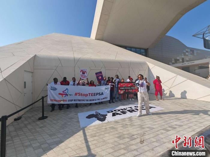 12月10日,阿聯(lián)酋迪拜,來自非洲的抗議者在COP28期間呼吁保護海洋環(huán)境、應(yīng)對氣候變化,反對在非洲使用化石燃料?!≈行律缬浾?龐無忌 攝