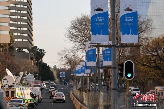 當(dāng)?shù)貢r(shí)間2023年8月20日,南非約翰內(nèi)斯堡大街上懸掛著金磚峰會(huì)條幅。中新社記者 盛佳鵬 攝