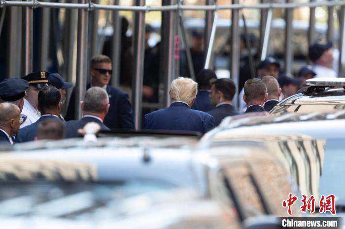 2023年4月4日,紐約曼哈頓刑事法院,美國前總統(tǒng)特朗普的背影。中新社記者 廖攀 攝
