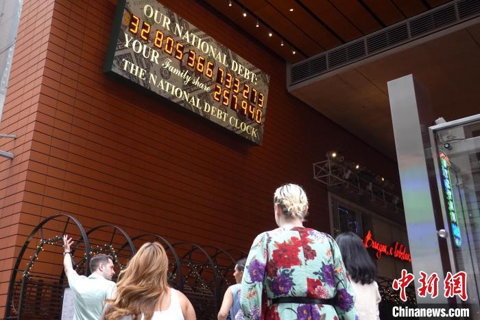 2023年8月15日,紐約曼哈頓,美國“國債鐘”顯示屏前的背影。中新社記者 王帆 攝