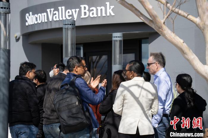 2023年3月13日,加州圣克拉拉市,硅谷銀行總部門前排隊等待辦理業(yè)務(wù)民眾的背影。中新社記者 劉關(guān)關(guān) 攝