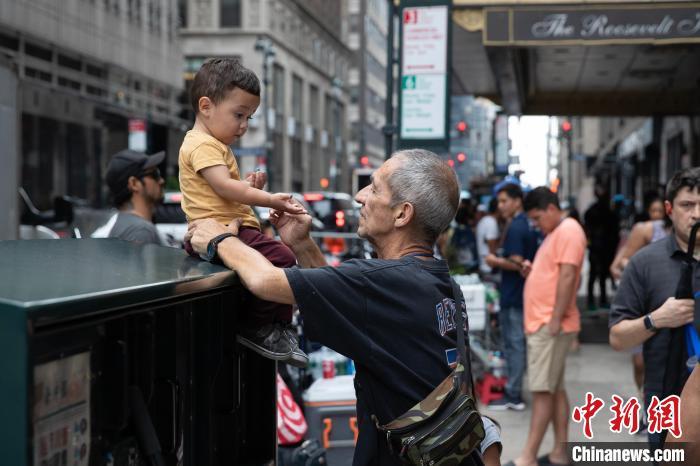 2023年8月15日,紐約曼哈頓,一家收容庇護移民酒店門前的背影?!≈行律缬浾?廖攀 攝