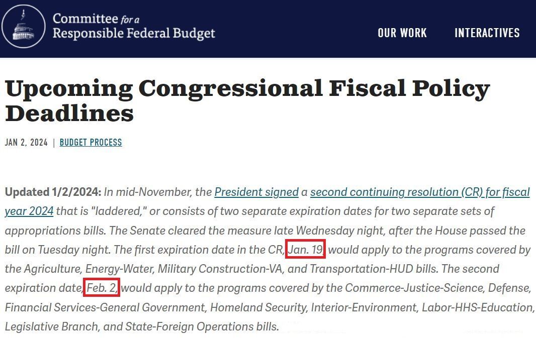 據(jù)悉,國會議員們將在下周結(jié)束新年假期返回華盛頓,繼續(xù)解決從去年9月上一財年結(jié)束時延宕至今的政府支出問題,特別是及時處理上述兩個涉及“最后期限”的難題。