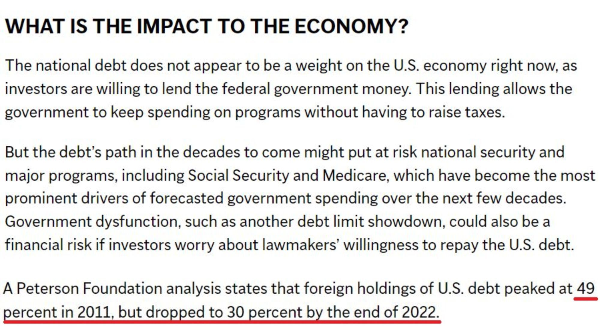 事實上,美國國會黨爭和政府功能失調(diào)引發(fā)的多次債務(wù)上限之爭和債務(wù)違約險情,已迫使國際買家紛紛減持美國國債。根據(jù)彼得森基金會的數(shù)據(jù),海外投資者所持美債份額在2011年曾達到49%的峰值,但到2022年底已降至30%。