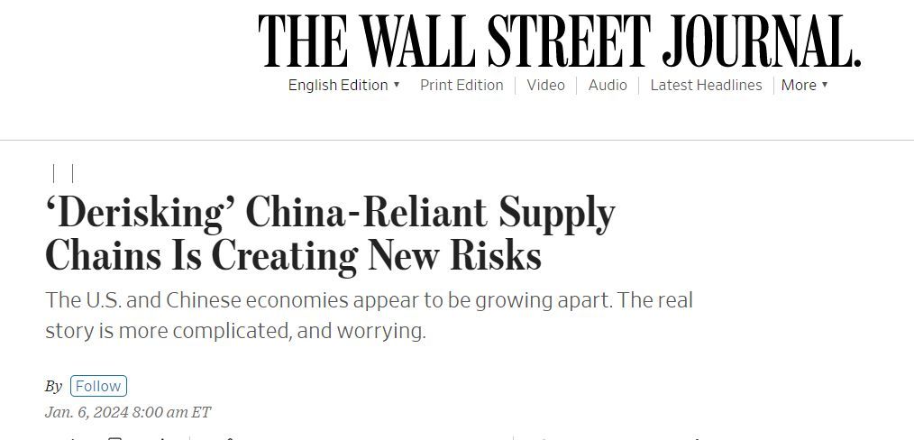中國日報網(wǎng)1月8日電 美國《華爾街日報》網(wǎng)站報道稱,最新研究揭示了美西方針對中國供應(yīng)鏈實施“去風(fēng)險化”政策的實際效果。初步結(jié)論令人擔(dān)憂:旨在打造彈性供應(yīng)鏈的相關(guān)措施,可能是虛幻的。結(jié)果將導(dǎo)致全球供應(yīng)鏈變得更為復(fù)雜,反而會產(chǎn)生新的風(fēng)險。