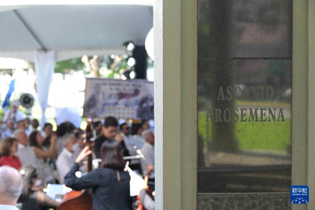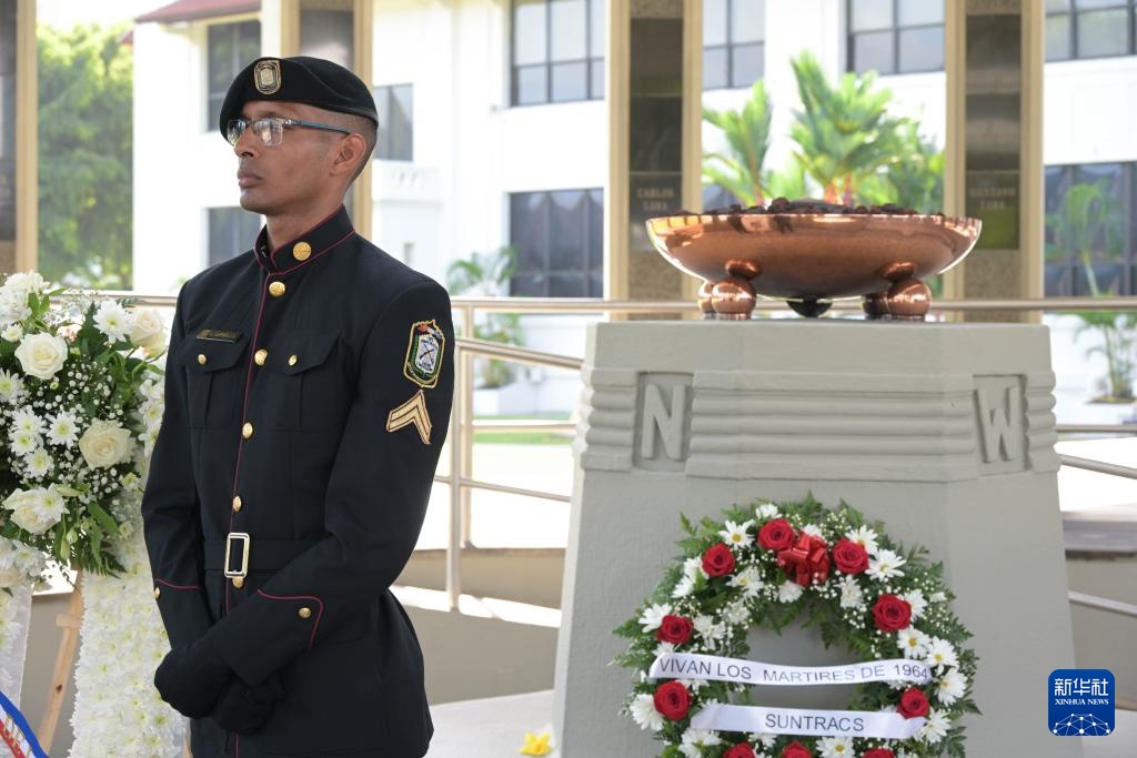 1月9日,在巴拿馬首都巴拿馬城,巴拿馬政府在“永恒之火”紀念碑旁舉辦“護旗運動”60周年紀念儀式,照片中的石柱紀念的是在美國軍警鎮(zhèn)壓中死亡的第一位學生阿羅塞梅納。新華社記者 陳昊佺 攝