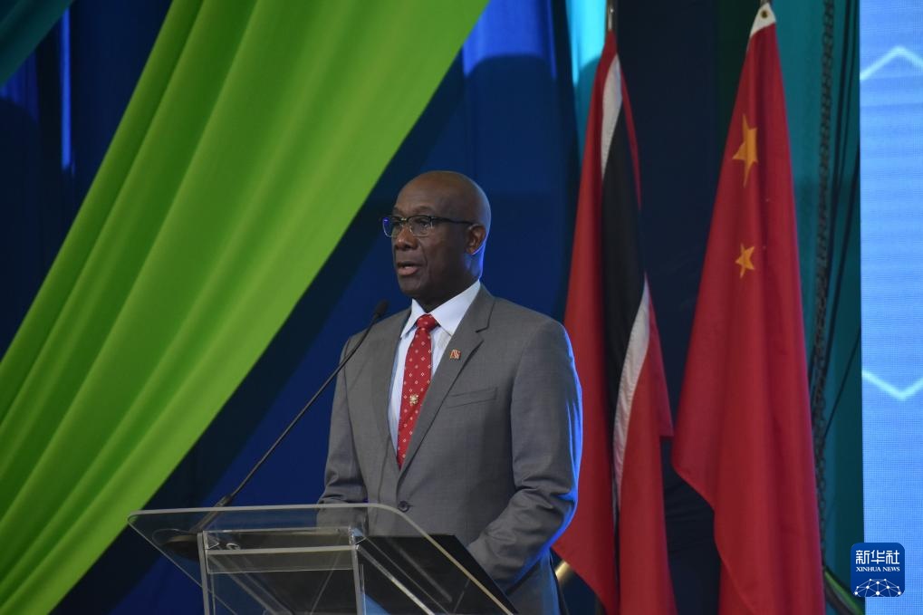 1月10日,特立尼達(dá)和多巴哥總理羅利在位于利薩斯角港的鳳凰工業(yè)園開園儀式上致辭。新華社記者 朱婉君 攝
