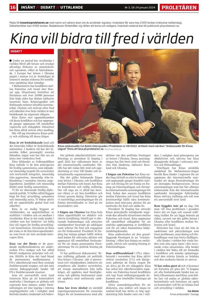 人民網(wǎng)斯德哥爾摩1月18日電 (記者殷淼)1月18日,中國(guó)駐瑞典大使崔愛(ài)民在瑞典《無(wú)產(chǎn)者報(bào)》發(fā)表題為《為世界和平發(fā)展貢獻(xiàn)中國(guó)力量》的署名文章,著重介紹中國(guó)在烏克蘭危機(jī)和巴以沖突等熱點(diǎn)問(wèn)題上的政策和立場(chǎng)。崔愛(ài)民強(qiáng)調(diào)指出,“通過(guò)對(duì)話解決沖突和爭(zhēng)端,為恢復(fù)和平作出不懈努力,以自己的方式發(fā)揮建設(shè)性作用”是中方一貫堅(jiān)持的明確立場(chǎng)。崔表示,希望所有愛(ài)好和平的國(guó)家同中方一道,秉持全球安全倡議精神,為促進(jìn)地區(qū)和平與發(fā)展繼續(xù)發(fā)揮建設(shè)性作用。全文如下: