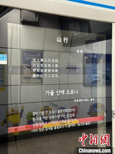 記者21日來(lái)到首爾地鐵明洞站看到,在6-1號(hào)屏蔽門兩旁的透明玻璃門上用白字印著唐代詩(shī)人杜牧的詩(shī)作《山行》,下方還印著韓文翻譯,并標(biāo)注杜牧的生卒年和國(guó)籍及譯者。