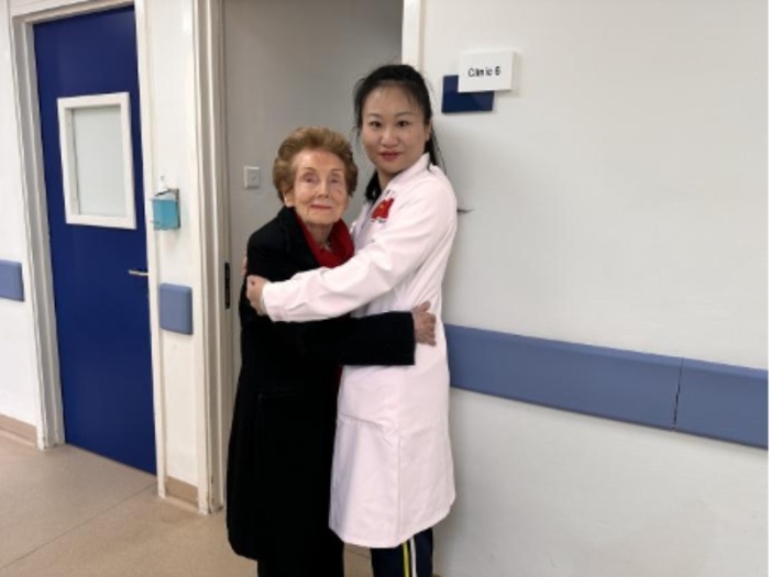 今年1月,索尼亞因為摔跤受傷,再次來到中醫(yī)科針灸。通過之前與患者的詳細溝通,高醫(yī)生已知老人獨自居住,兒子在國外工作,起居只有一名保姆照顧,因此除了給予針刺治療外,她還細致地向患者及其保姆進行了老年人防跌倒注意事項的宣教?!霸蹅円黄鹋膫€照吧,我要把照片發(fā)給兒子,讓他知道我被一位來自中國的甜心醫(yī)生照顧的很好?!彼髂醽喺f完就熱情地擁抱住高醫(yī)生,留下了這張溫馨的合影。