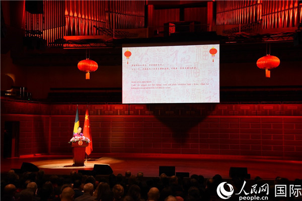 中國駐瑞典大使崔愛民在新春招待會上致辭。人民網(wǎng)記者 殷淼攝