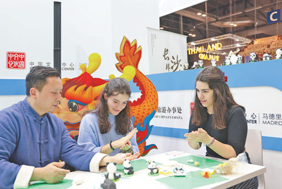在中國展臺,來自湖南的金杵面塑手藝人正在教觀眾基本的面塑技藝,制作大熊貓造型的紀念品。本報記者 顏歡攝